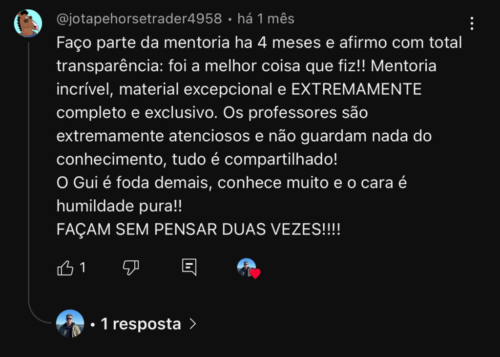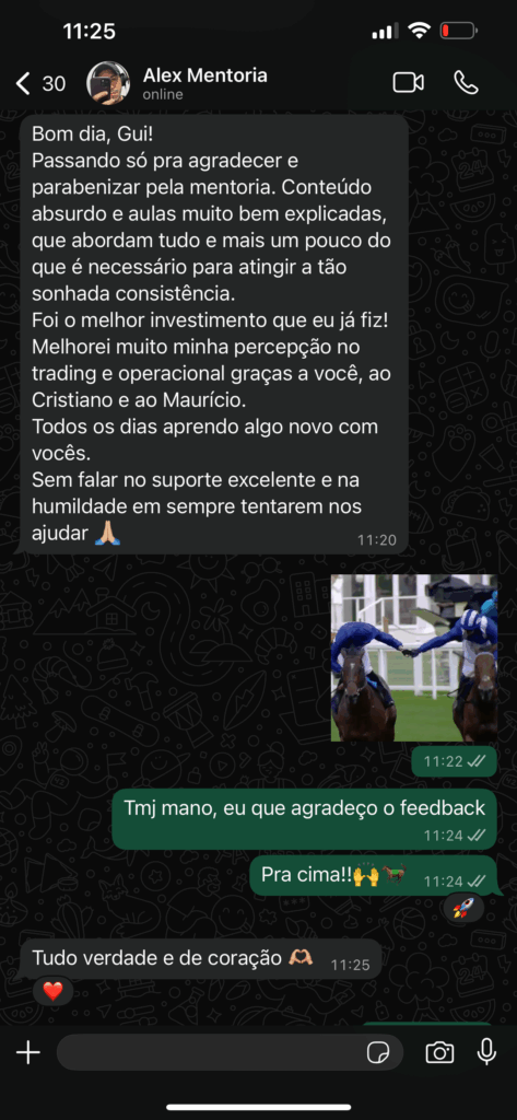 O trading em corrida de cavalos mudou minha vida para sempre, tendo um horário de escritório muito confortável para trabalhar (normalmente das 10h às 14h) uma renda média acima de 20mil reais por mês com o trading, ainda com possibilidades de escalar muito, e tempo para tocar outros negócios.