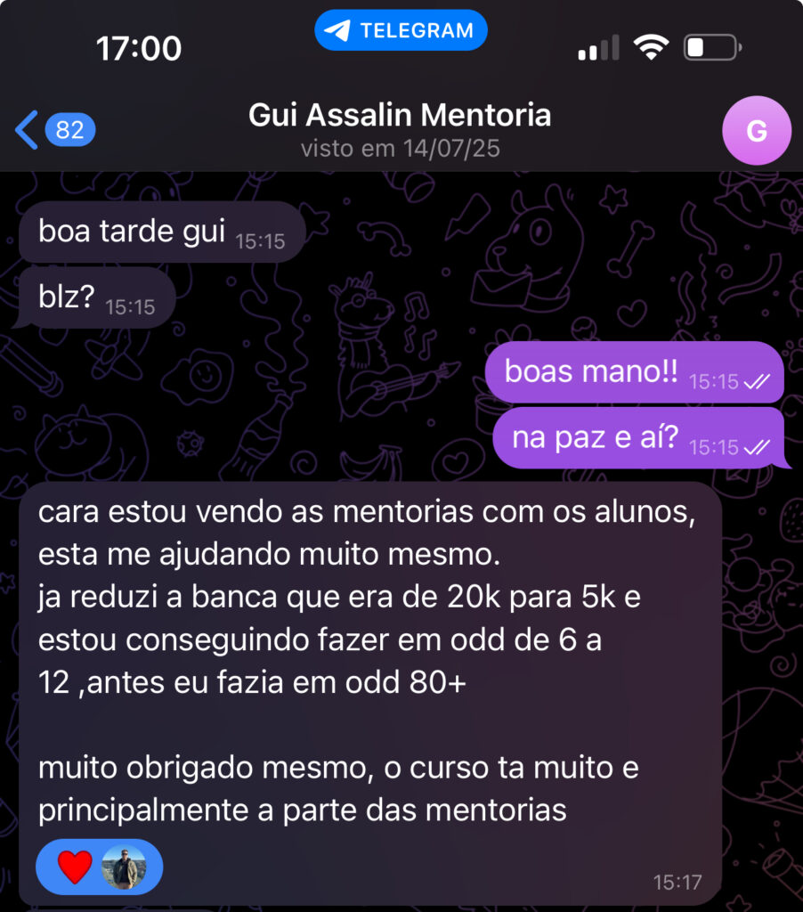 Sou o Guilherme, tenho 29 anos, faço trading esportivo desde 2017, larguei quase 9 anos de banco, com um salário acima de 7k mensal para VIVER DOS CAVALOS, postei várias vezes meus resultados (inclusive de médio prazo) no meu próprio canal do Youtube e sempre compartilho também com os meus alunos no grupo privado.